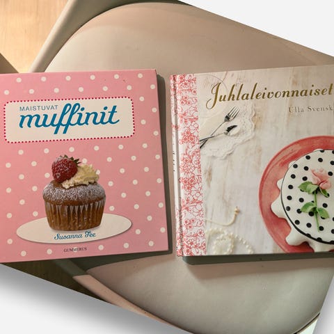 Myytävänä Ulla Svenskin leivontakirjat Unelmakakut ja Juhlaleivonnaiset. Hinta on kappalehinta