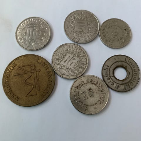 sekä 2 kpl Stockmann-poletteja (viim. kuva) 1,50 e kpl, tekstit Oy Stockmann Ab 1862-1962 Semper in Tempore suo ("Aina ajan tahdissa" suomennettuna). Stockmann-poletit ovat Wäinö Aaltosen suunnittelemia!
