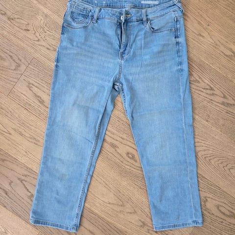 Vaaleat farkkucaprit. Kuminauhavyötärö. Pyörineet kaapinperällä.
