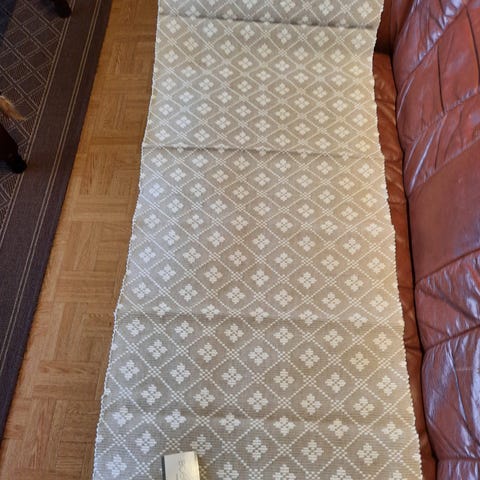 Lilasävyinen Kaitaliina, joissa päissä hapsut, leveys 58 cm, pituus 120 cm, ehjä.