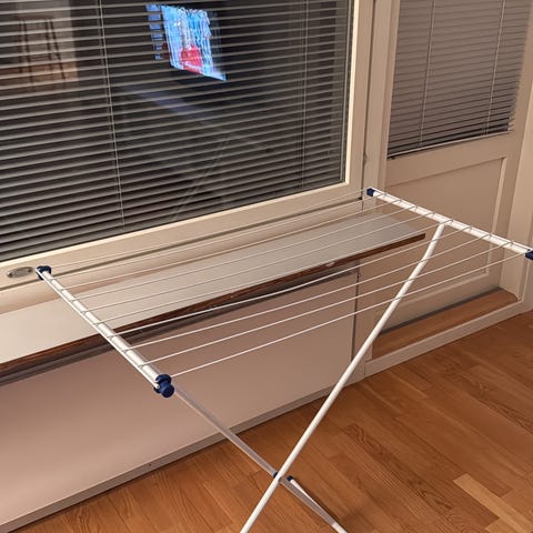 Pyykin kuivausteline..Viisi hengaripaikkaa.Seinään kiinnitettävä