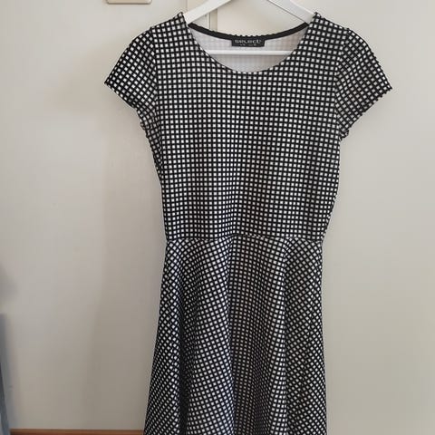 Mustavalkoinen mekko, vyö. Koko S/M. Kai-kai 48 cm, vyötärö 80 cm, olka-helma 95 cm. Jotain polyesteria. Vyö tekonahka.