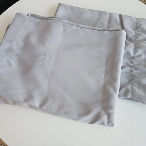 Valkoinen, missä kuvioita, saa ylemmäksi 2:llä viininpunaisella nauhalla, verhossa ylhäällä 5 ripustus lenkkiä, korkeus 147 cm, leveys 159 cm, verho pysyy ryhdissä (yläreunassa upotettu leveä metalli levy nauhakujaan ja 5 kpl ohuempaa metalli nauhaa keskellä, ehjä siisti ja tahraton.