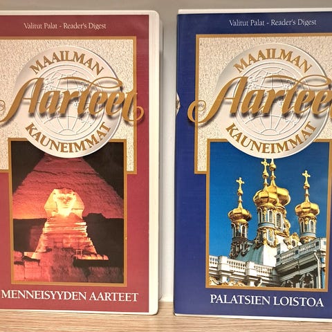 Valittujen Palojen Maailman kauneimmat aarteet-sarjan Menneisyyden aarteet, Palatsien loistoa ja Häikäisevä luonto v 1996. Lukijoina Tapani Perttu/Titta Jokinen, kasettien kesto 60 min/kpl.Palatsien loistoa ja Häikäisevä luonto-kasetit vielä suojamuoveissa, Menneisyyden aarteet-kasettia katsottu vähän alusta. Hinta 4e/kpl ja postitus