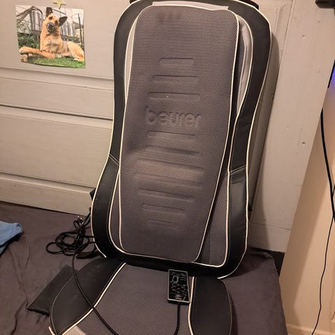 Kuvan hierova istuin. Asetetaan tuoliin. Toimii ja on tehokas. Kaukosäädin.