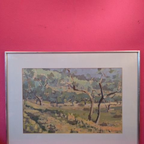 Mauno Olavi Häkkisen öljyvärityö Viljan puinti. Työn korkeus on 11 cm ja leveys 16 cm. Kehys 17 X 23 cm.