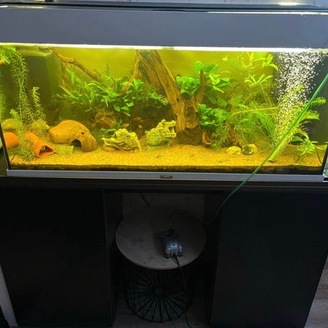 100 litran akvaario(, jonka leveys 70cm× syvyys 35cm × korkeus 50cm<-tähän laskettu mukaan valaisimet, jotka akvaarion päällä ) alustakaappeineen(, jonka koko leveys 80×korkeus 73× syvyys 46,5cm ) ja akvaariovalaisimineen, suodatin sekä -tarvikkeita