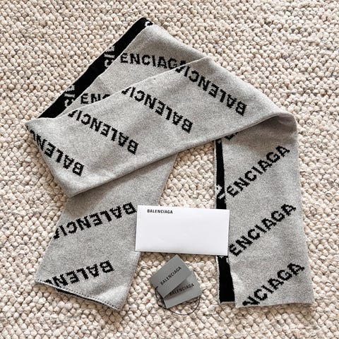 Myyntiin Balenciagan cashmere (70%)/ villa (30%) logo scarf. Väri musta/harmaa ja huivia voi käyttää molemmin puolin. Koko 30 x 205 cm. Ostettu luxbagista, käytetty vain pari kertaa, ei käytön jälkiä, pesulaput kiinni.