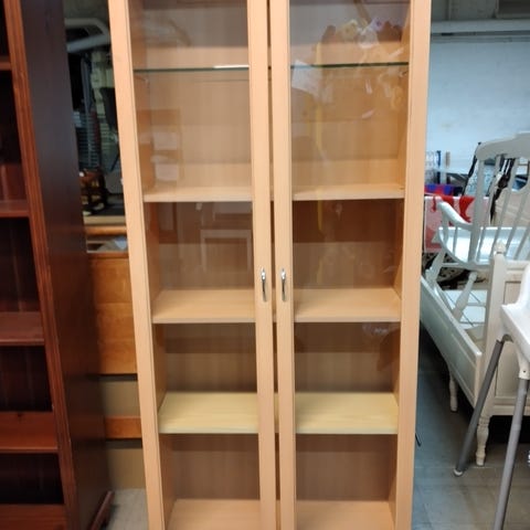 Yläosassa lasiovet ja yksi lasihylly.