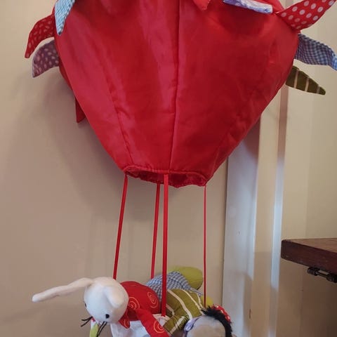 Pepita ruudullinen, vaaleanpunainen kuumailmapallo, jossa matkustaa nalle. Soiva. Siisti. Pk 7.90e