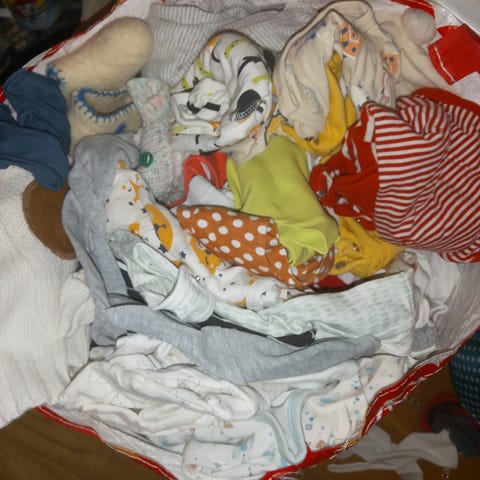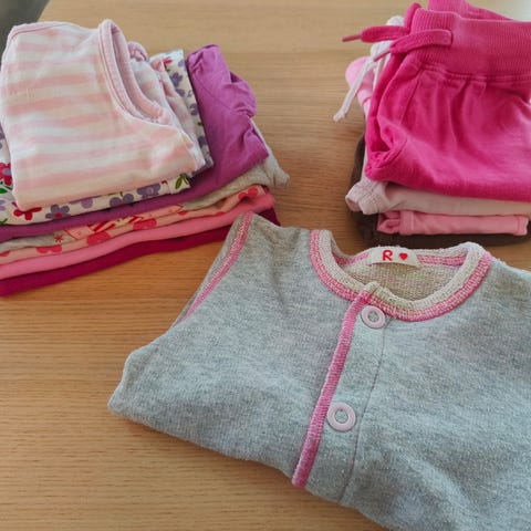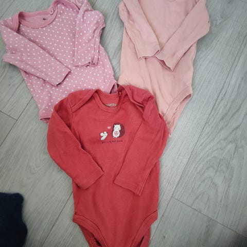 3kpl potkuhousut, 1 body, 1 shortsihaalari, 1 valkoinen kietaisupaita. Raidallisen potkuhousun taskun yläpuolella pieni reikä (kuva)