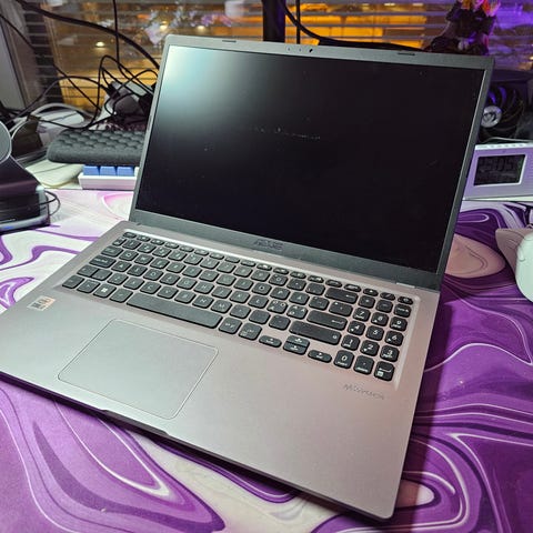 Asus kannettava tietokone, jossa on näppäimistö ja kosketuslevy. Laite on harmaan värinen ja sopii monipuoliseen käyttöön.