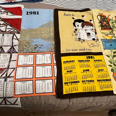 Myydään kalenteripyyhkeet vuosilta 1985, 1989, 2010 ja 2014.