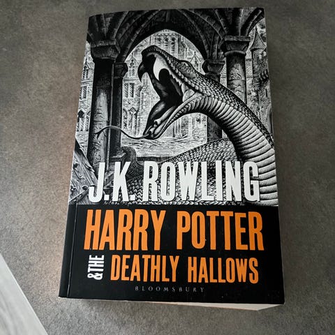 Hyväkuntoinen Harry Potter and the Deathly Hallows-kirja. Vuosia vanha, joten kansilehti hieman kulunut.
