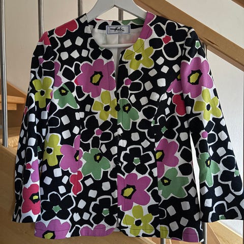 Myydään hienostunut valkoinen Mustilla koristeilla oleva ryhdikäs vintage jakku.