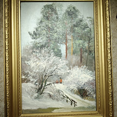 Tuntemattoman taiteilijan öljyvärityö Lato pohjoisessa. Työn korkeus on 35 cm ja leveys 46 cm. Kehys 45 X 55 cm.