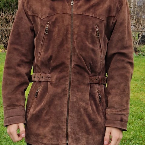 Päällinen mokkajäljitelmää, vuori vuorikangasts. Koko merkintä 36, mutta on aika reilu koko. Väri vähän vääristää kuvassa. Takki on käytännössä uusi, kerran kokeiltu.