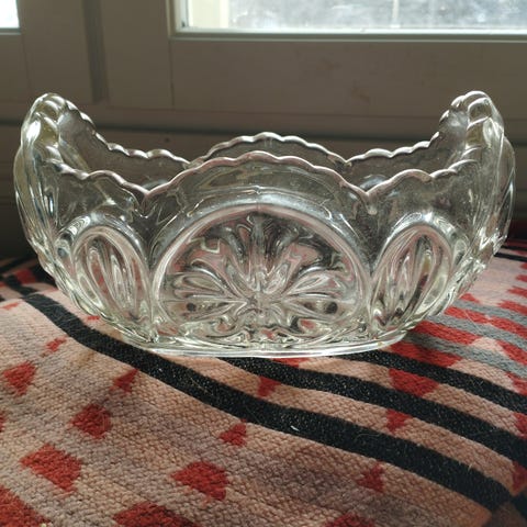 Tarpeettomaksi jääneitä lasisia tarjoilukulhoja.