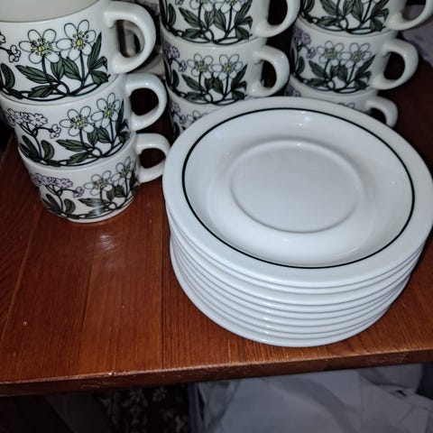 Ulla Procopen käsin maalaamat kuppi ja lautanen. Koko 0.5 l. Ehjät mutta käytön jälkiä löytyy.