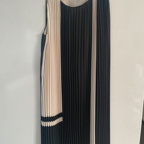 Musta, vaaleilla kukilla kuvioitu satiinimekko, jossa napilla kiinni oleva musta vyö.