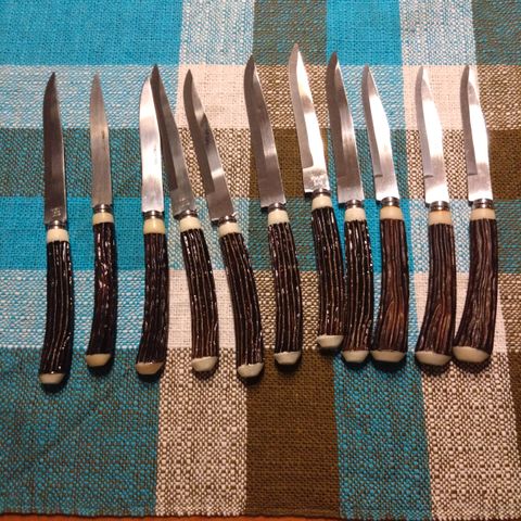 Hyväkuntoiset veitset (6 kpl) puisessa telineessä.