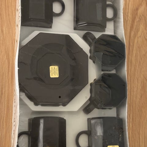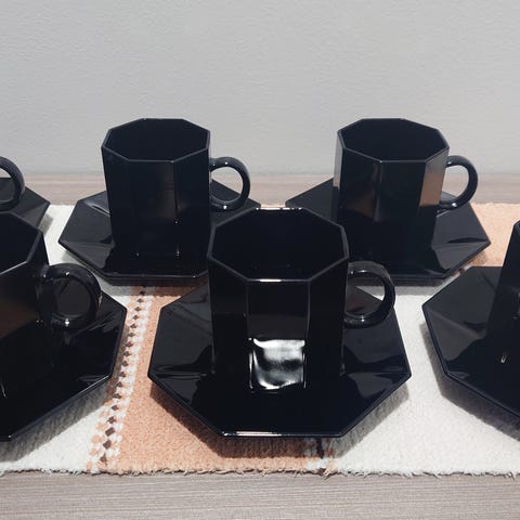 6kpl mustia kahvikuppeja ja lautasia. Yhdessä lautasessa ja yhdessä kupissa lohkeamat, niistä kuvat. Muut ehjiä. Voin lähettää, pakkaan hyvin