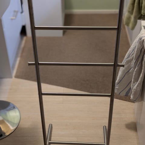 Pikkutakin teline, ylin vaakataso on murtunut / poikki kuvan mukaisesti. Ylätason voi poistaa kokonaan halutessaan. Korkeus 103, leveys 48 ja syvyys jalkojen osalta 36.