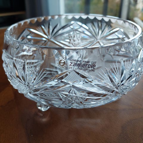 Myydään 10 cm korkea 16,5 cm halkaisijan vanha kristallikulho. Pohjalla joitain käytön tuomia naarmuja ja siirtelyjälkiä.