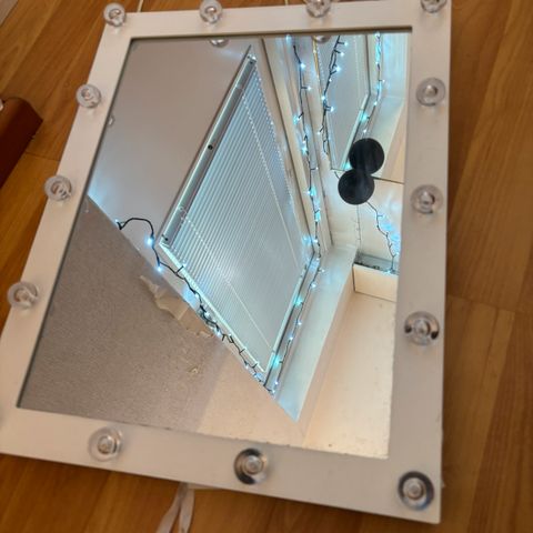 Peilissä on valot ja takana jalka joka pitää peiliä pystyssä ja pattereille paikat löytyy myös takaata. Pysty suunnassa 46cm sivu 36cm. peiliin löytyy myös piuha töpseliin ettei tarvitse pattereita