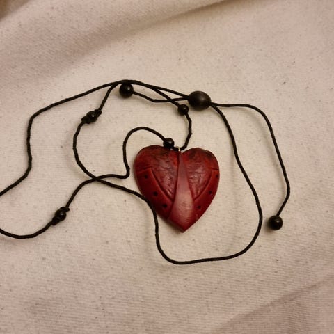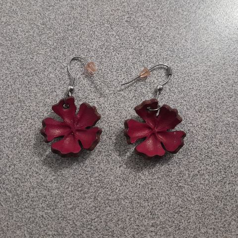 Suomalainen nahkainen kukkariipus, jossa pieni koristehelmi keskellä. Koko noin 75 x 65 mm. Yläosassa riipuslenkki samaa materiaalia, kuulemma aitoa nahkaa. Käyttämätön nahkakoru on valmistettu käsityönä Suomessa.