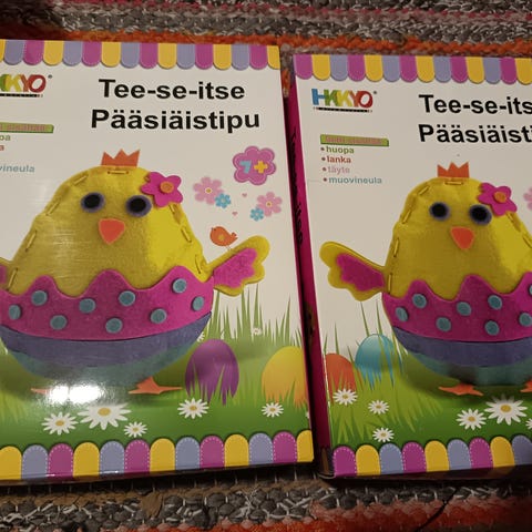 Pääsiäisaskarteluun; pussillinen höyheniä ja samanverran irtonaisena , 3 e. Posteineen.