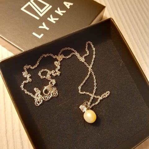 Nikki Lissonin 'White Pearl' -kaulakoru, hopeapäällysteinen ja 3 helmiä sivussa. Erittäin herkkä, sopii myös Nikin riipusten kanssa käytettäväksi. Viimeisessä kuvassa sama ketju, mutta kullanvärinen. 80 cm pitkä, kulumaton, poistettu pakkauksesta vain kuvien ottamista varten. Vähittäishinta yli 80.