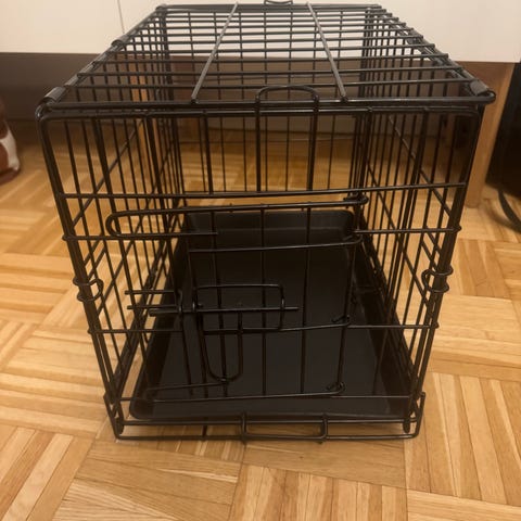 Metallinen koiranhäkki. Ei mikään kaunotar ja kyljessä lommo, mutta toimii autossa ihan hyvin. Ollut käytössä mutta nyt luovutaan kun ei enää tarvetta….