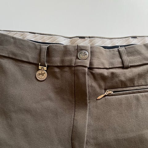 Pikeur kokopaikkaiset naisten ratsastushousut kokoa 38 (pienehkö). Malli on muistaakseni Montana, aavistuksen matalampi vyötärö kuin Luganoissa, mutta ei mikään lantiomalli. Väri ruskea (vihreään taittava) tummanruskeilla tekomokkapaikoilla. Laadukas kangas hyvässä kunnossa, paikkojen tikkauksissa lanka katkennut parista kohtaa, ei vaikuta käyttöön. Lempparihousut, mutta valitettavasti vain jatkavat kutistumista kaapissa.