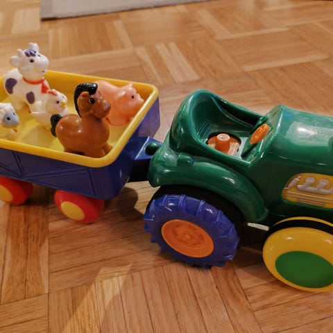 Soiva traktori ja kärry eläimillä. Jokaisesta eläimestä myös ääni.