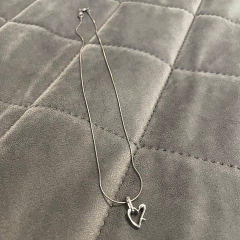Hopeanvärinen pullea sydän kaulakoru, riipuksen mitat 2,5 cm x 2,3 cm. Sydänriipuksen sisälle on upotettu valossa kimaltavia strasseja ja riipuksen toisella puolella on peilipinta reikäkuvioinnin alla. Uudenveroinen.
