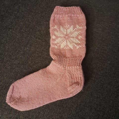 Seitsemän veljestä lankaa. Väreinä valkoinen ja punaisen sävyjä. Koko 39-40. Pohjan mitta 24 cm venyttämättä. Langan vaihtokohta näkyy sisäsivussa, kuten kuvassa. Lähetys 5,50 € ei toridiiliä.