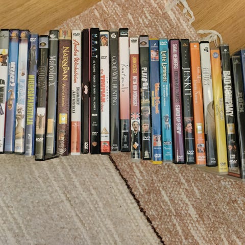Valikoima DVD-elokuvia. 1,5€/kpl tai 15€/kaikki.
