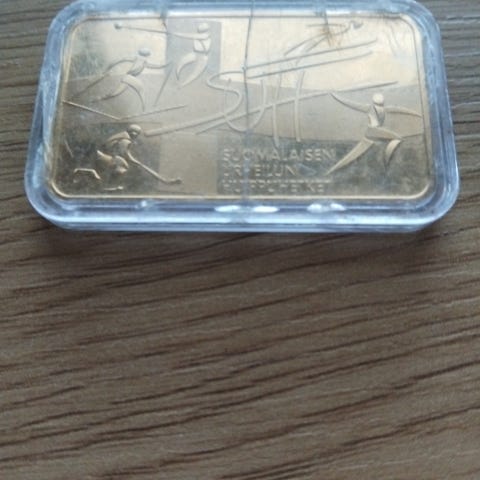 Metallinen tunnuslaatta, jossa on kaiverrettuja numeroita. Laatta on kiinnitetty kestävällä narulla. Sopii käytettäväksi tunnistamiseen tai koriste-esineenä.