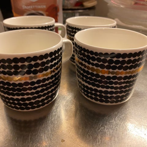 Marimekon 10th anniversary / 10. juhlavuosi mukit. Mukeissa kultareunus. Vetoisuus 2,5dl. Erinomainen kunto.