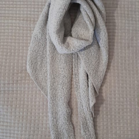 Myydään kaulahuivi. Huivi on musta ja siinä on punaisia kukkia kerman väristen neliöiden keskellä missä on oranssit reunat.