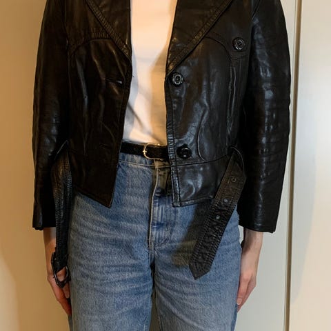 Naisten 80-luvun tyylinen pitkä nahkatakki, jossa on kaulaa ympäröivä ylevä karvoitus ja edessä vyö ja mustat napit. Takki ei näytä vanhalta ja on laadukas. Takki pukee hyvin.