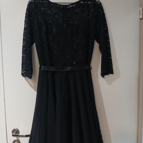 Musta Swing juhlamekko, koko XS. Ostettu Haloselta. Yläosassa ja helmassa pitsikoristelu. Kerran käytetty.