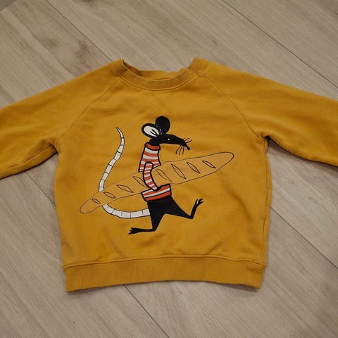 Tanskalaisen Phister & Philina koko 104cm tai 4 vuotta, luomupuuvillainen kolitsipaita. Hihassa pikkuruinen saksen kärjistä tullut reikä joka ommeltu huomaamattomasti, katso viimeinen kuva. Paita on tahraton ja nukaton. Meillä ei ole lemmikkejä ja pesty allergiaystävällisesti.