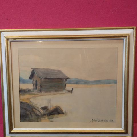 Kiva akvarelli aitta,järvimaisemalla. Alkuperäiset ohuet puukehykset