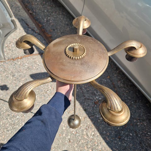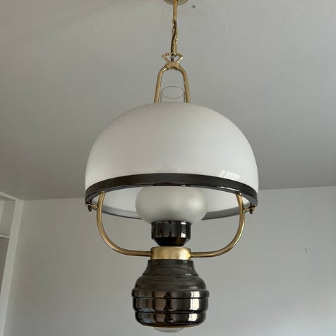 Vanhassa rautaisessa kattolampussa lasinen kupu lampun ympäriltä . Jos kiinnostuit jostain lampusta, niin tarjoa hintaa.