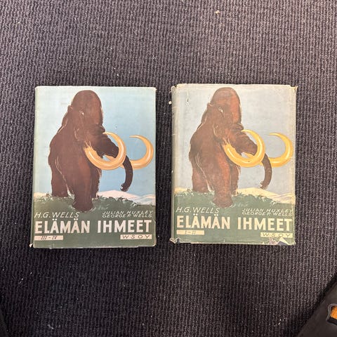 H.G.Wells / Julian Huxley / G.Ph. Wells : Elämän ihmeet I, 5. painos 1952, WSOY, kovakantinen. Kansissa ja selkämyksessä kulumaa, kansissa kellastumaa, selkämyksessä pieniä tahroja. Sivujjen syrjissä kevyttä ikäkellastumaa.