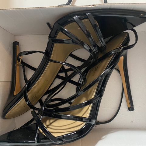 Kengät ovat mustat ja kimaltavat, niittejä.