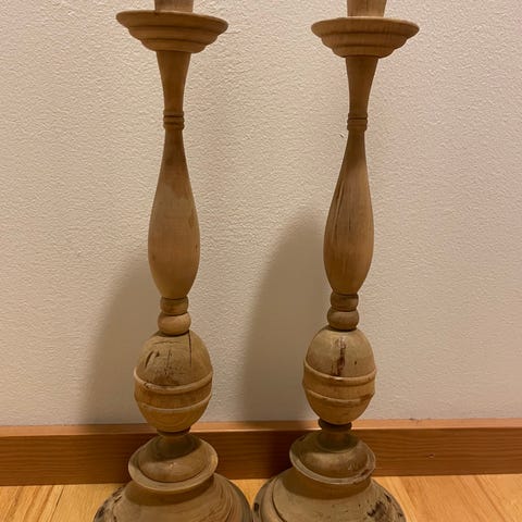 Puinen jykevä kynttilänjalka, pellavalankakerät, vanhanaikaiset napit, metallinen vyö :