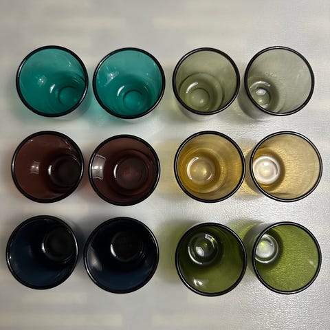 Nuutajärvi 5023, des. Kaj Franck, neljä ehjää vanhaa snapsilasia. Kauniita ajattomia värejä, mukavan kokoinen lasi myös esim tyrnishotille tai lapsille, pysyy pienenkin kädessä. Kaunis kattauksissa, tuo väriä ja ajan patinaa.